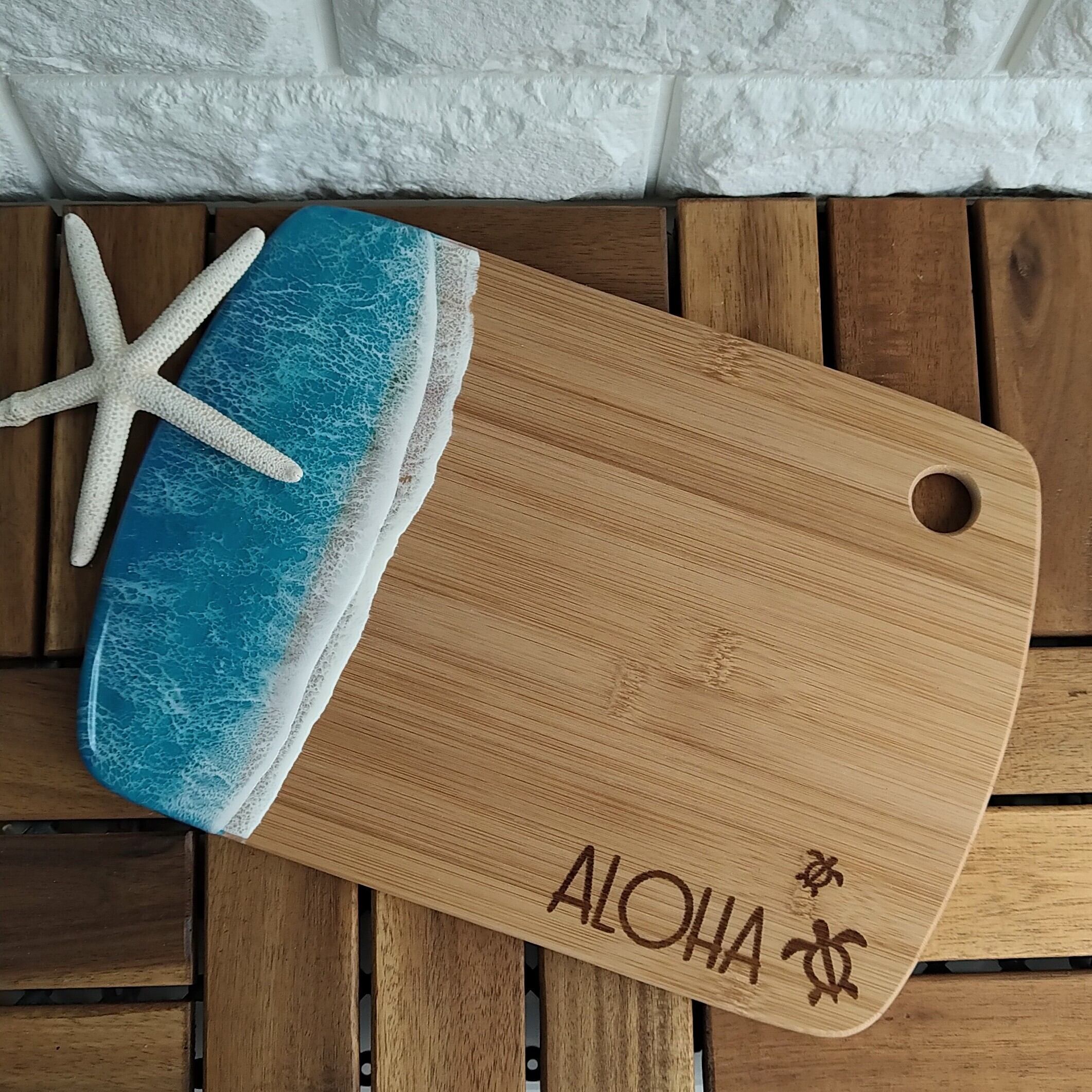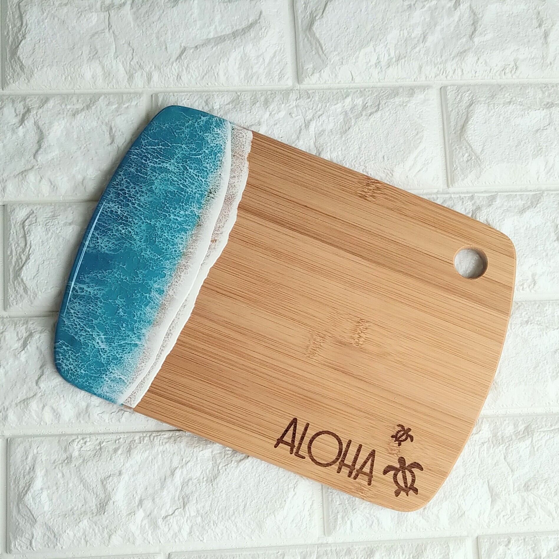 竹素材のボードにハワイを感じる海を流しました。ホヌを焼印しています。