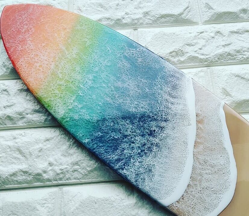 木製のサーフボード型にハワイを感じる海を流しました。